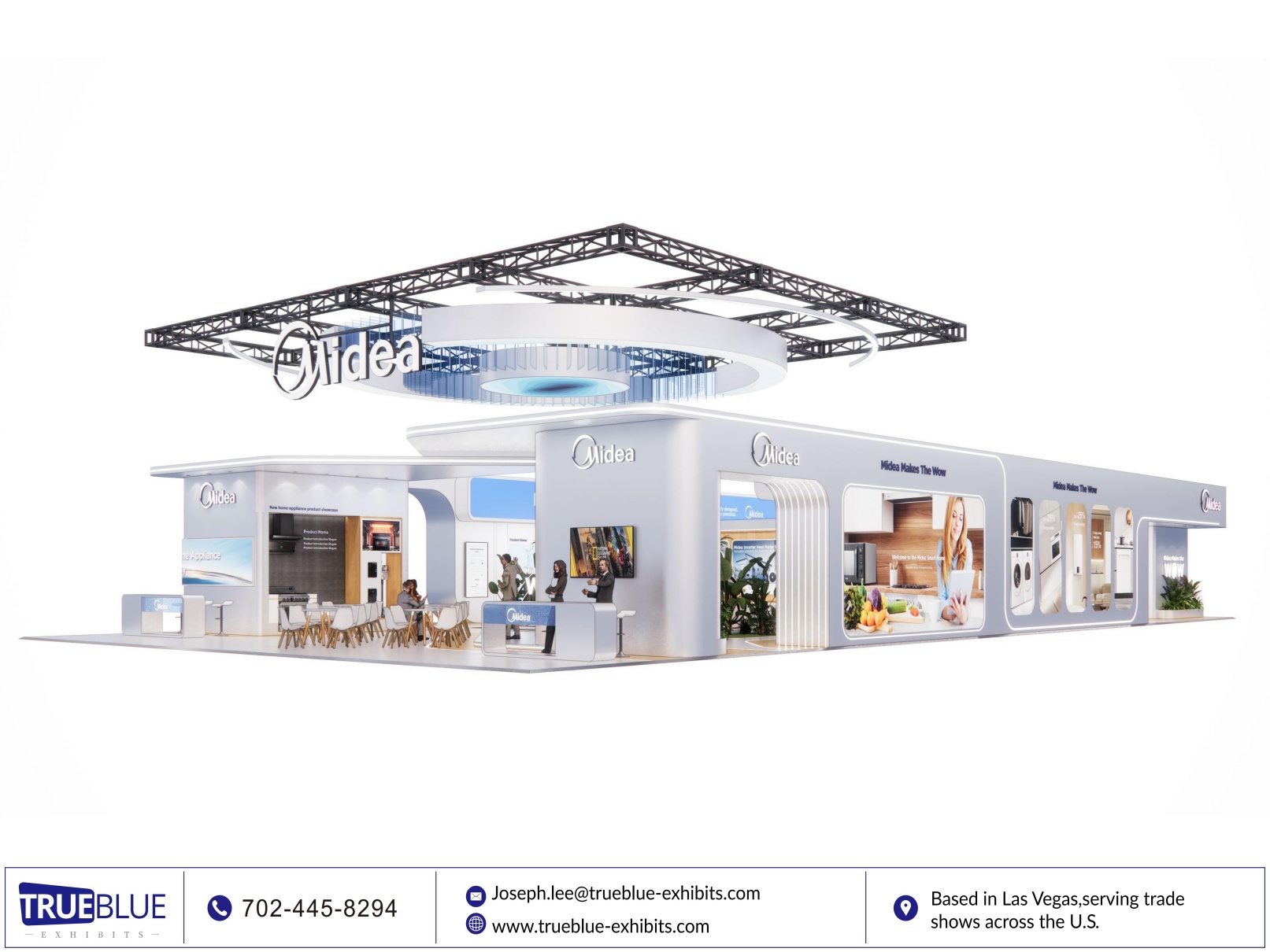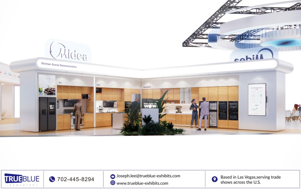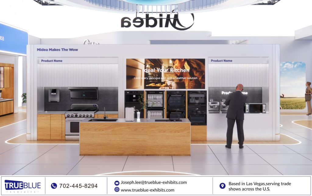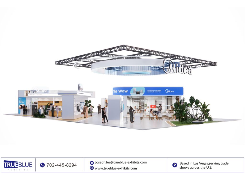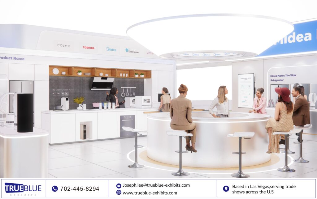 Media KBIS 2026 60′ x 120′ 3D Booth Renderings by TrueBlue Exhibits showcase innovation, precision, and immersive design for the premier kitchen and bath trade show. This massive custom booth highlights TrueBlue Exhibits’ expertise in large-scale trade show environments, featuring detailed 3D renderings with cutting-edge materials, dynamic lighting, and functional zones for product display and media engagement. The 60′ x 120′ layout emphasizes open flow, strong branding visibility, and advanced presentation technology.