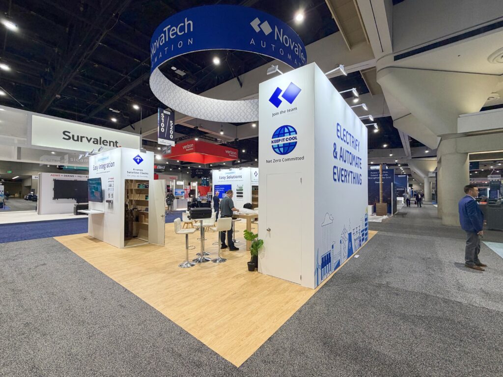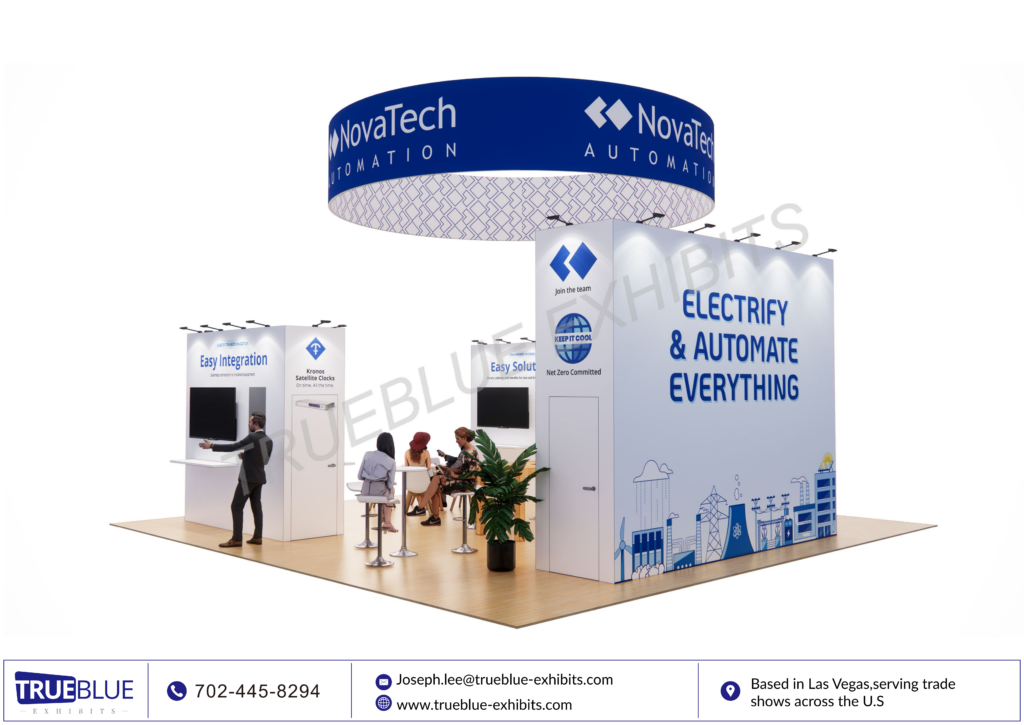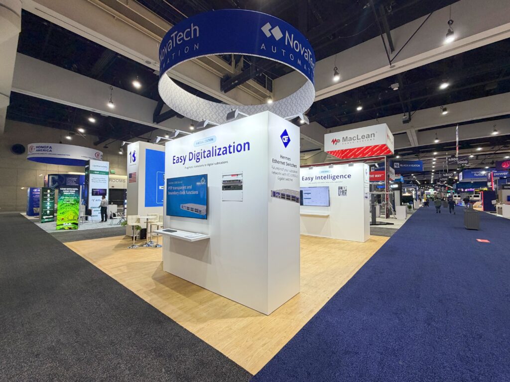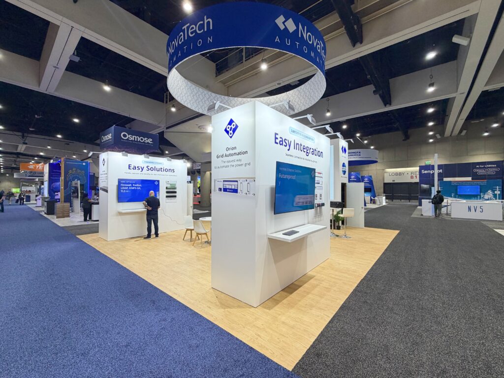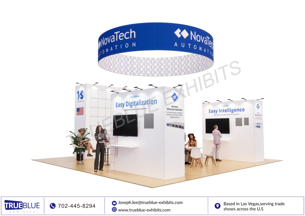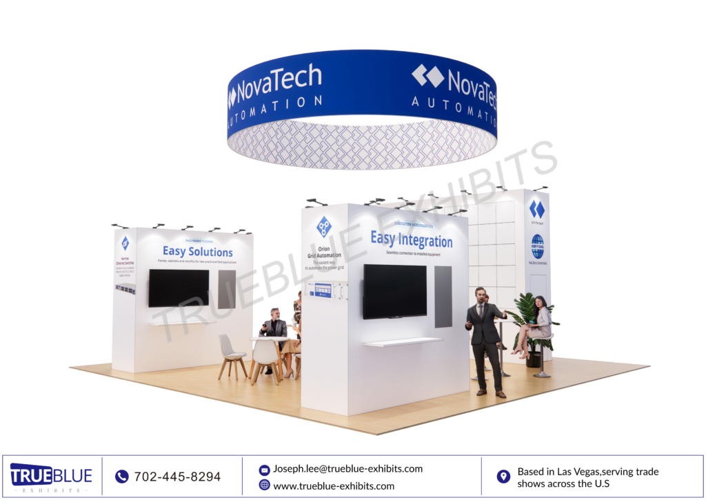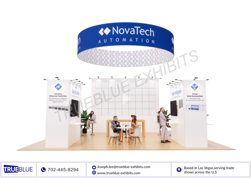 At DISTRIBUTECH 2026 in San Diego, NovaTech Automation will be presenting its state-of-the-art energy automation solutions in a contemporary 30′ x 30′ custom exhibit booth, designed and fabricated by TrueBlue Exhibits. This exhibit booth has bold overhead branding, LED video integration, interactive product demo areas, and meeting areas that invite meaningful conversations with industry professionals in the utility and grid technology space. Clean lines and lighting emphasize NovaTech’s cutting-edge technology while providing maximum visibility from anywhere on the show floor. This exhibit booth is designed with engagement in mind, combining technology, branding, and functionality to create a powerful presence and build high-value industry connections.