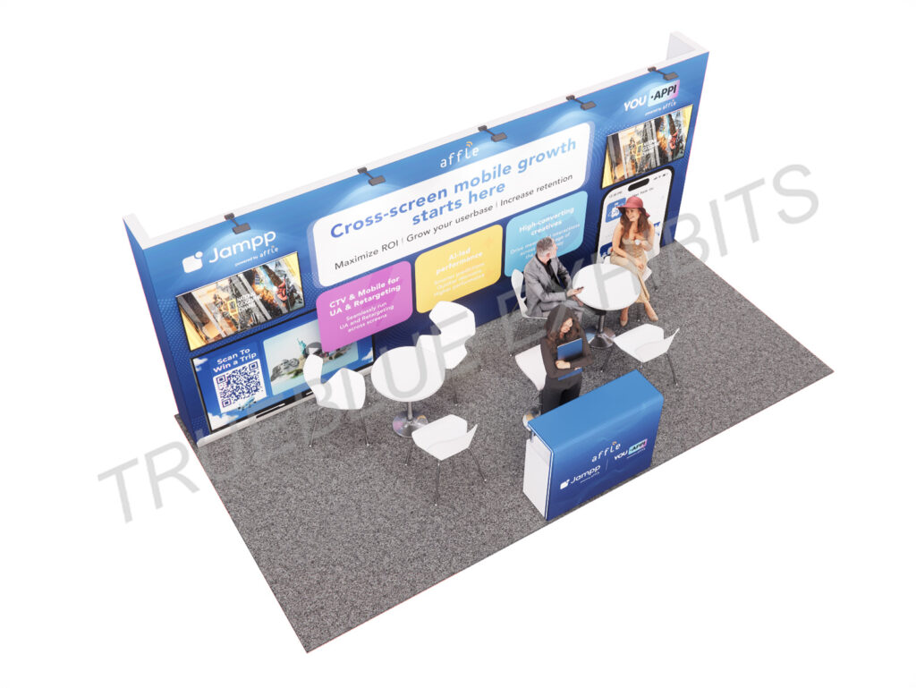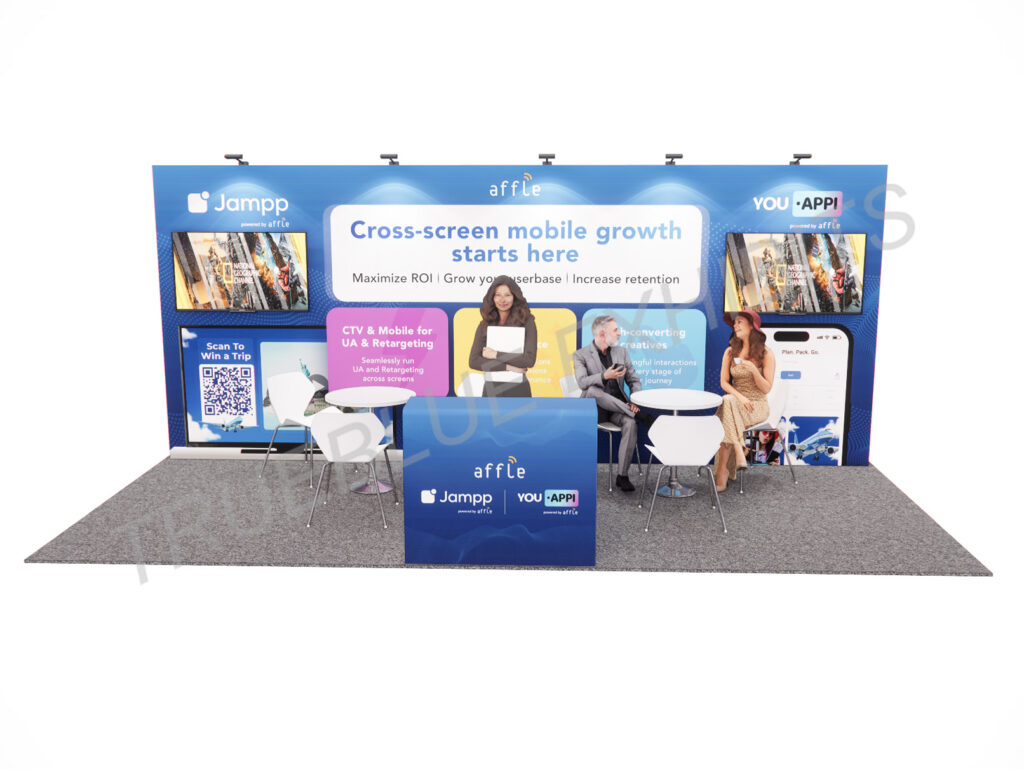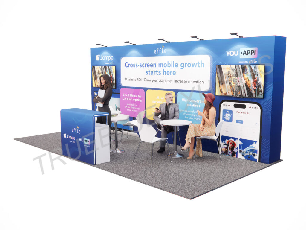 TrueBlue Exhibits specializes in custom trade show booths that can be bought or rented, available in different sizes and price ranges. Our team of professionals is proficient at creating booths that accurately showcase our client’s brand identity, products, and services, using top-notch graphics, lighting, furniture, and accessories. Contact us for our comprehensive turnkey booth services throughout the US, including Las Vegas, which include delivery, setup, and dismantling, and let us help you create an impressive display that will make a lasting impression on your audience.