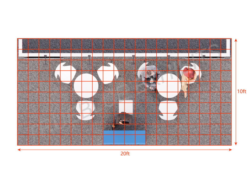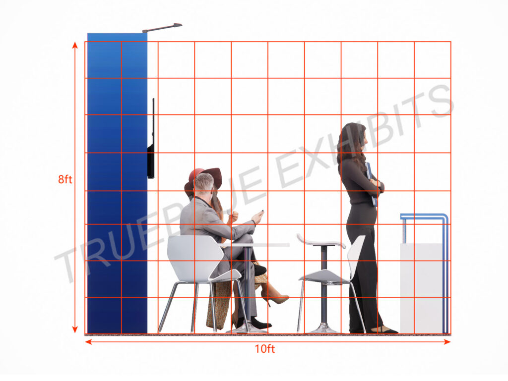 This Las Vegas 10′ x 20′ booth rentals layout is an excellent choice for individuals seeking a minimalistic style. It features a back wall which usually dominates the booth’s space and serves as an ideal platform to showcase your brand and communication. This back wall can have a TV screen mounted. Additionally, a front reception counter is also present.